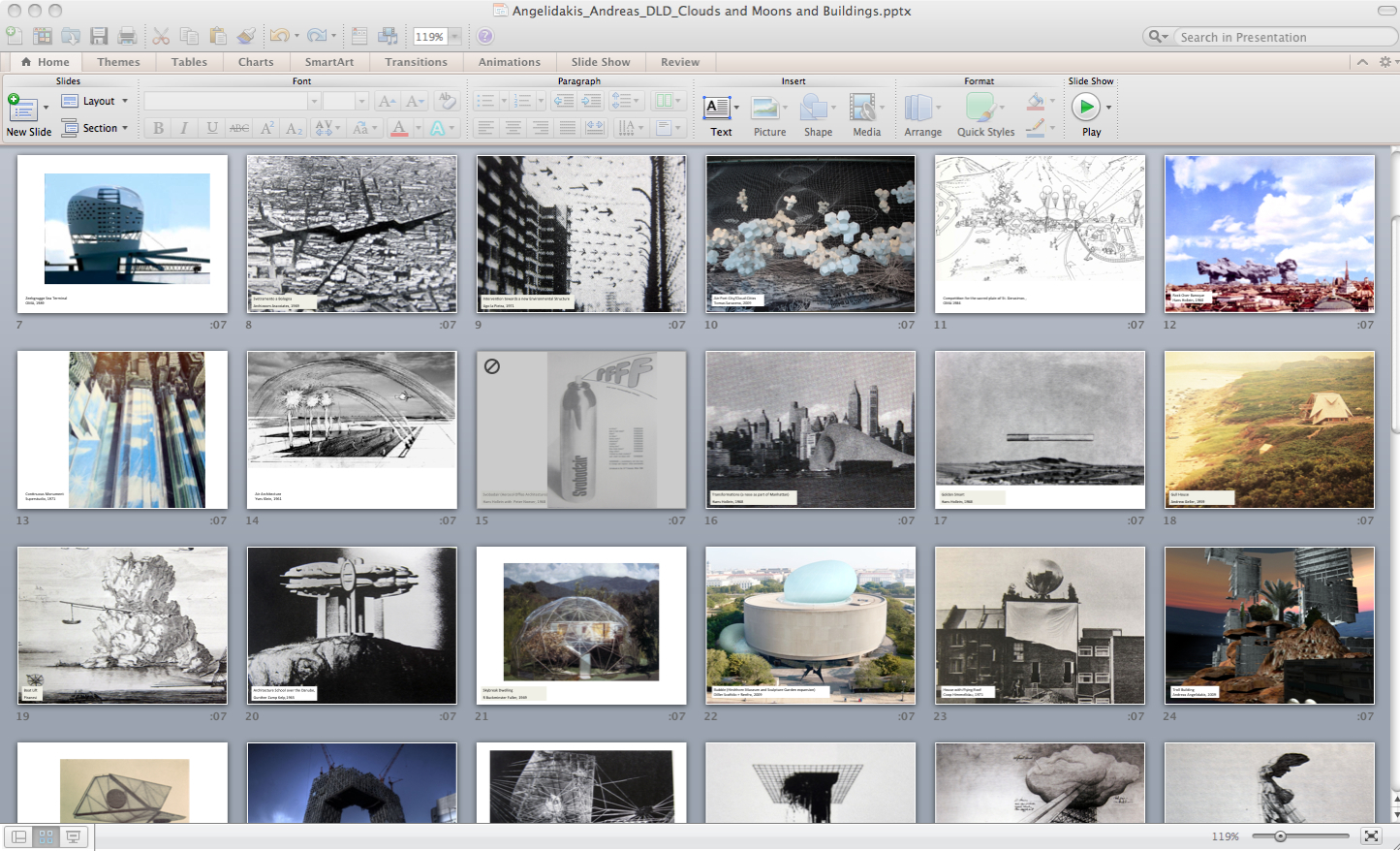 Clouds and Moons and Buildings is a powerpoint presentation of 55 slides that juxtaposes contemporary and historical visionary works that float among the clouds, from Tomas Saraceno's 2009 Cloud House to Lebbeus Woods's 1984 City of Air to Angelidakis's own Cloud House to works by Doomdough, Ettore Sottsass, and others.