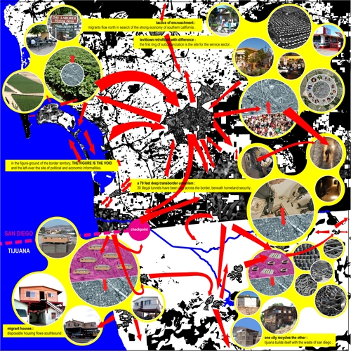 The work of estudio teddy cruz builds out of these trans-border urban dynamics between Tijuana and the San Diego border, using this territory of conflict as a backdrop to critically observe the clash between current top-down discriminating forms of urban economic re-development and planning legislature (as expressed through dramatic forms of unchecked eminent domain policies supporting privatization and NYMBYism), on one hand, and the emerging American neighborhoods nationwide made of immigrants, on the other, whose bottom-up spatial tactics of encroachment thrive on informality and alternative social organizational practices. Cruz’s projects primarily engage the micro scale of the neighborhood, transforming it into the urban laboratory of the 21st century. What is interesting here is not the ‘image’ of the informal but the instrumentality of its operational socio-economic and political procedures.