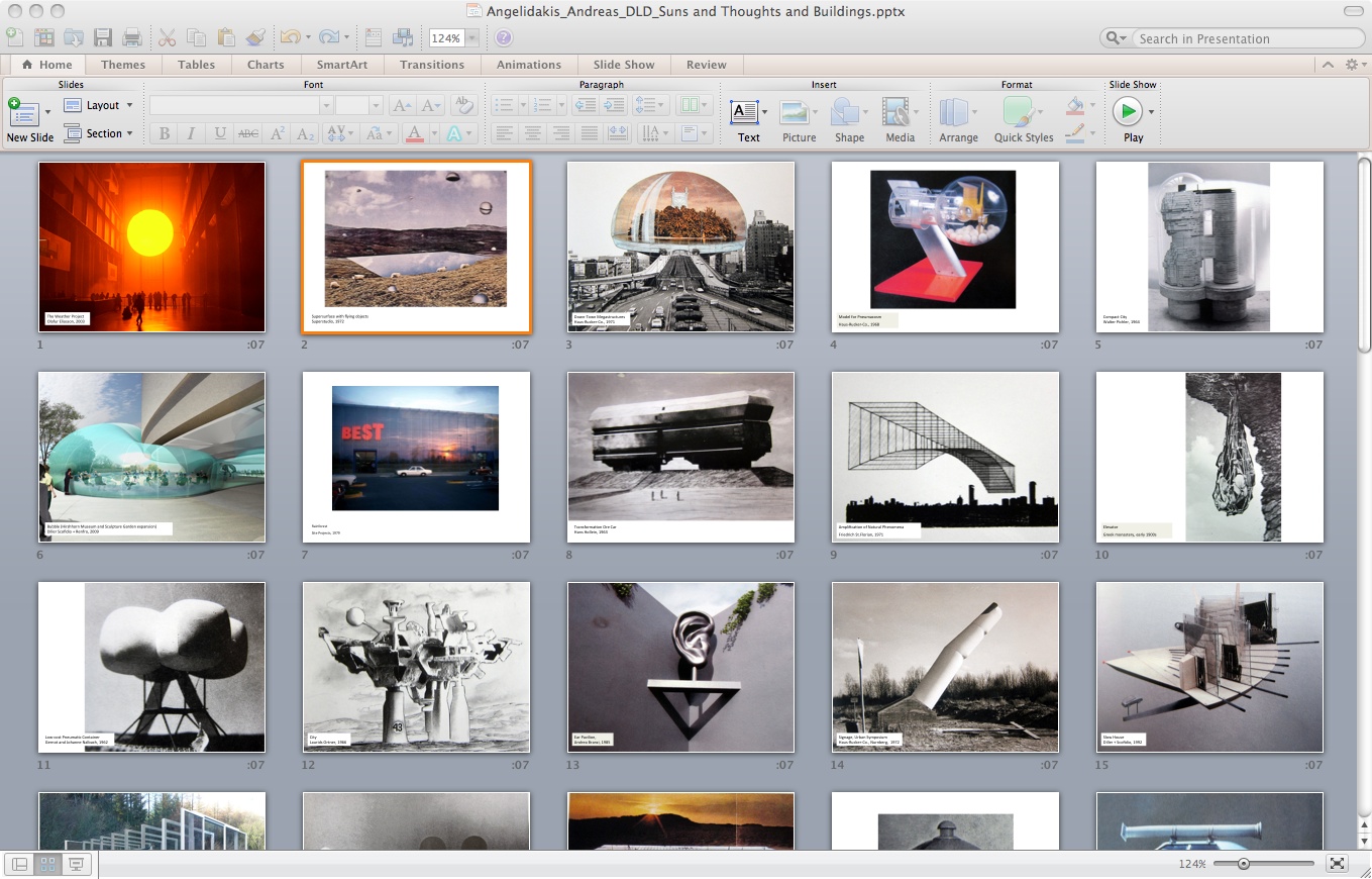 Suns and Thoughts and Buildings is a powerpoint presentation comprising 57 slides that juxtaposes historical and contemporary visionary projects, from Joseph Paxton's Crystal Palace to Philippe Rahm's climatic environments to Olafur Eliasson's Weather Room.