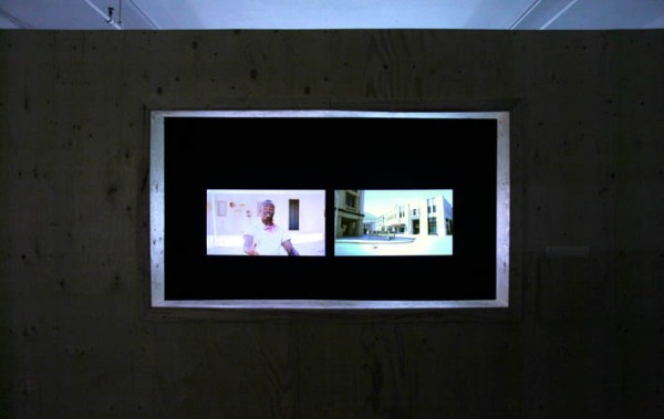 The spectator is then lead to another room, in which he will watch the two-channel video Mirages. The spectator watches the video through an opening in the wall which has the proportions of a movie screen (16:9). This opening makes an echo to images shown in the video. One shows the observation deck from which journalists are encouraged to film the theatre of operations; the other shows the mock hotel room in which journalists are invited to stay when they report on Fort Irwin. The window in that room also has the proportions of a movie/tv screen, as if what the military wanted the journalists to film was already framed for them. Those observation platforms confirm the idea that beyond the fact that Fort Irwin is a training camp for soldiers, it is also a training camp for viewers. Where the spectator's gaze is educated through the images produced by journalists. After watching the video, the spectator exists the dispositif through the 'back stage'.